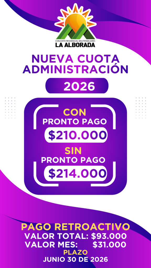 De acuerdo a la Asamblea realizada de 2026 la cuota de Administración para el Conjunto Residencial Multifamiliares La Alborada quedó estipulada de la siguiente manera:
